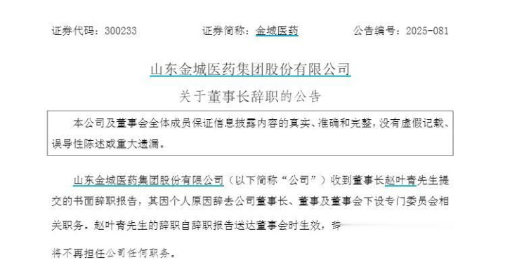 在监管处罚同步落地的归拢天,金城医药发布了《对于董事长离职的公告》。赵叶青因个东谈主原因央求辞去公司董事长、董事及董事会下设专门委员会的筹商职务,离职后将不再担任公 司任何职务。 为止公告流露,赵叶青共计捏有公司 2.88% 股份 , 为公司试验适度东谈主。