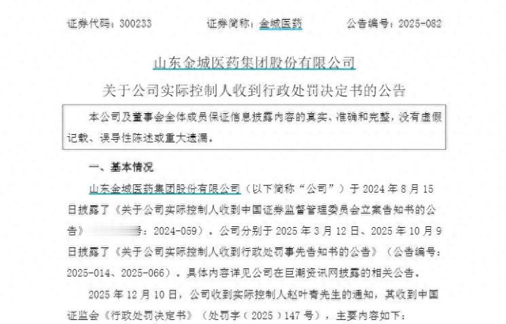 这次处罚决定书的落地,符号着金城医药实控东谈主被访谒事件的散伙,回溯了所有这个词这个词事件的前后经由, 2024 年 8 月 15 日,金城医药初次流露赵叶青收到证监会《立案奉告书》; 2025 年 3 月和 10 月,两次《行政处罚预先奉告书》延续投递,主宰证券商场的访谒事实不休了了。直至 12 月 10 日,处罚决定持重出台,所有这个词这个词访谒、听证周期历时一年多。
